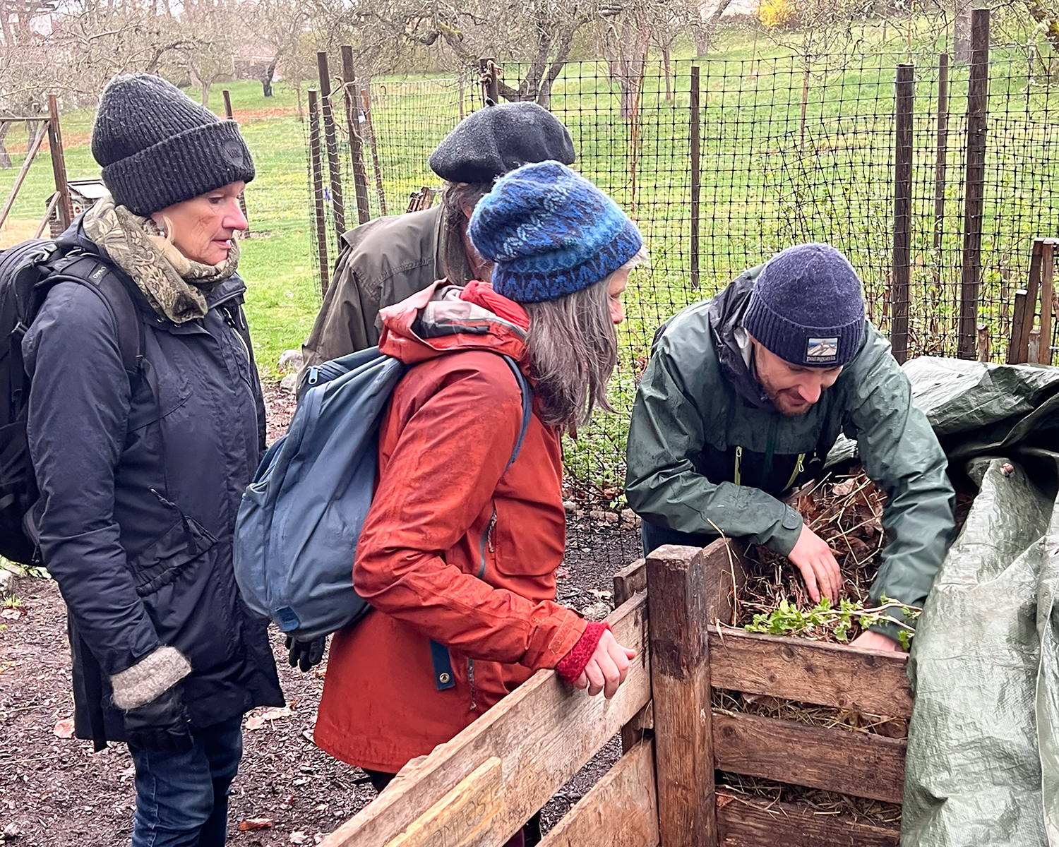 Vi har blivit lite av specialister på kompost och tar hand om matavfall från gårdens verksamheter. Grönsakerna vi odlar äter vi upp själva på våra boenden.